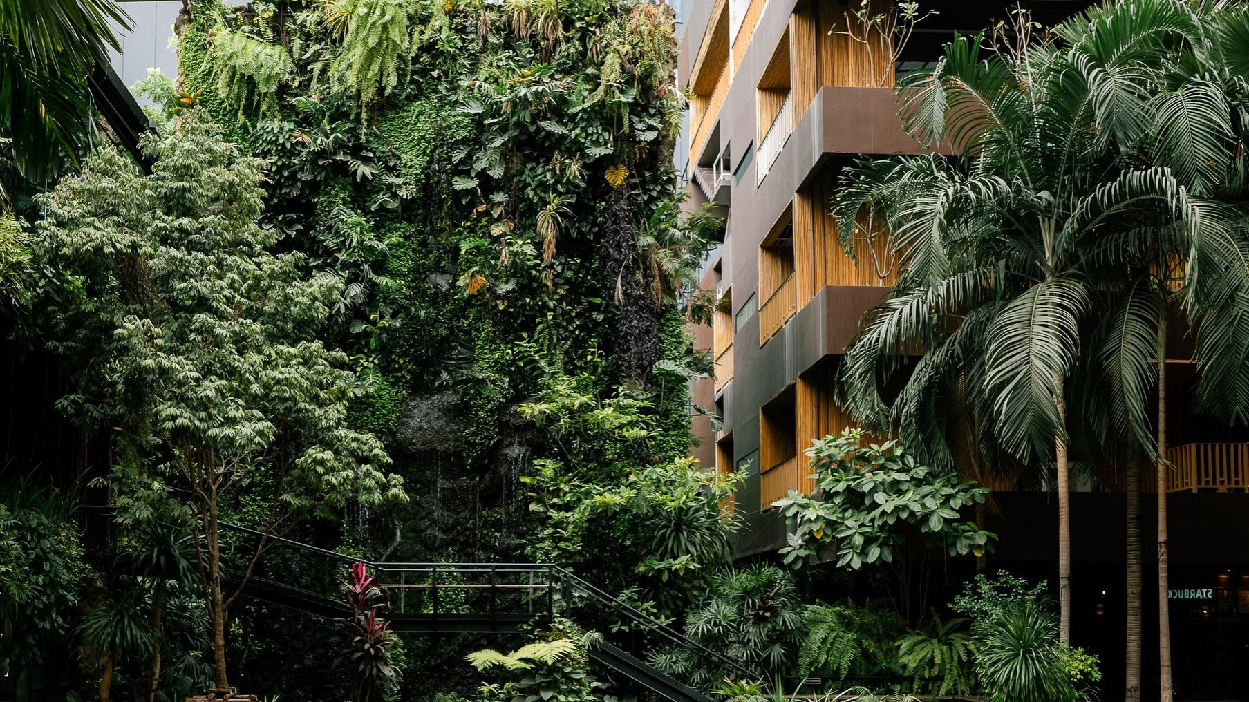 A semi-outdoor urban oasis space with a vertical waterfall garden as a backdrop.